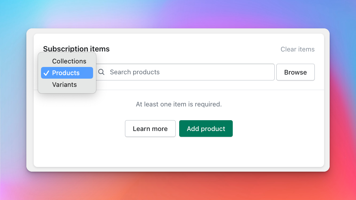 - Start by selecting if you’d like to add the products on a per variant, product or collection basis. Details on the difference can be found here: Getting started with Subscriptions